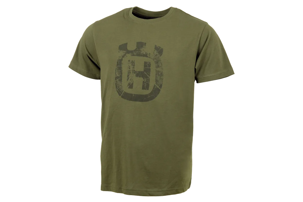 TシャツXプローラ長袖はユニセックスです。ハスクバーナのクラウンロゴが入った濃い緑色で、樹皮をイメージするプリントをあしらっています。着まわしの良い一着。
